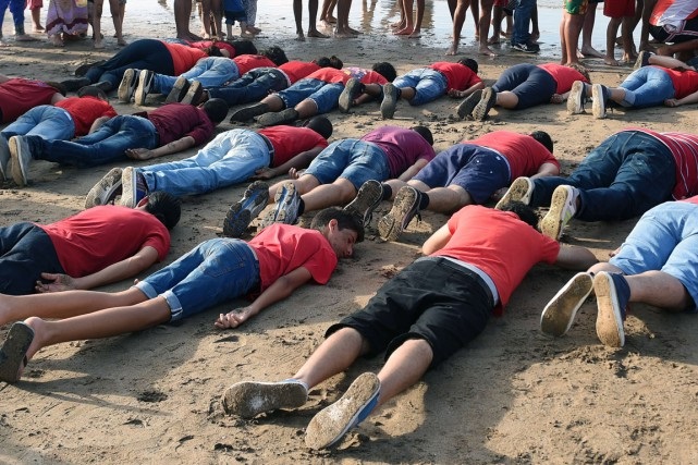 Ils ont reconstitué les faits tels qu’ils les ont vu à la télé, vêtus d’un tee-shirt rouge et d’un bermuda bleu, ils sont restés étendus sur le côté, comme le petit Aylan, pendant une vingtaine de minutes nous rapporte un journaliste de l’AFP.