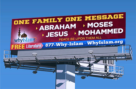 Depuis le 15 décembre dernier, une campagne intitulée « Une famille-Un message », consacrée à propager une autre image de l’Islam, et le faire connaître tel qu’il a été divulgué par notre prophète (sallah alayhi wa salam). Des panneaux publicitaires ont été répartis dans la région de Dallas. Le message véhiculé, cette année, a trait au partage d’un héritage commun aux 3 religions Abrahamiques.