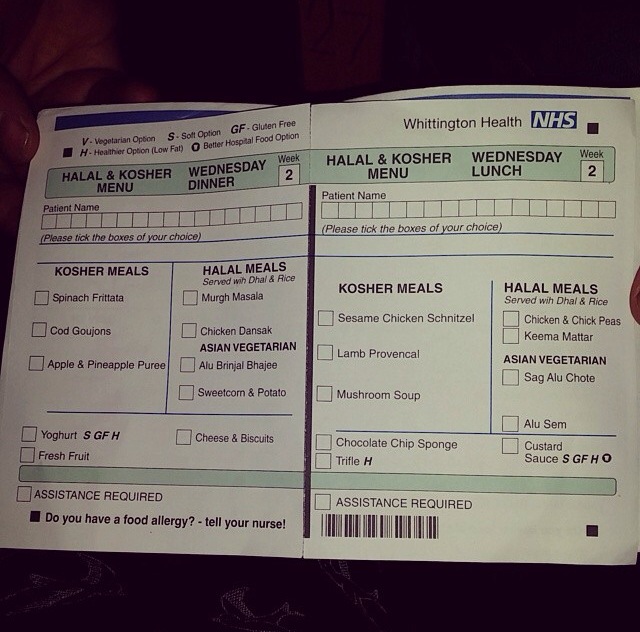 Dans les hôpitaux anglais, les patients ont le droit à un repas Halal, kasher, végétarien et même sans gluten…. (Cf. Photo)