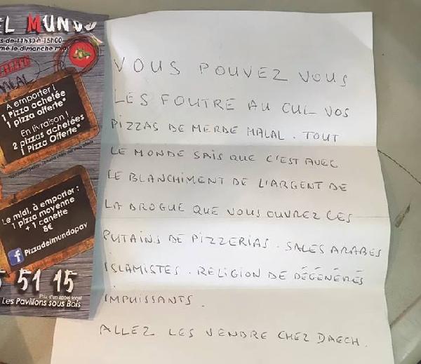 Le courrier contient des insultes islamophobes et de fausses accusations très graves portées à l’encontre de son commerce. L’expéditeur n’a pas hésité à accuser le propriétaire de la pizzeria de blanchir l’argent de la drogue et même d’avoir des liens étroits avec Daesh.