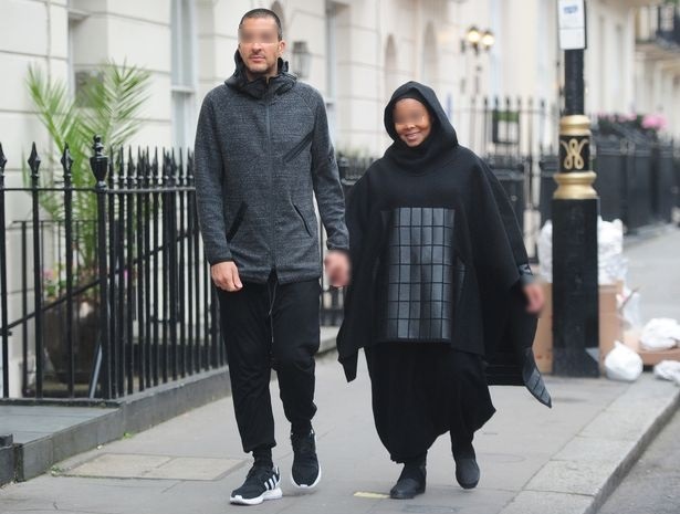Le couple passerait presque inaperçu si ce n’était la notoriété de la femme, et sa tenue par un long vêtement qui lui cache l’entièreté du corps.