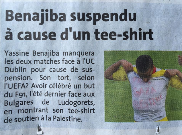 L’Eté dernier, Yassine Benajiba en a fait les frais. Lors de l’un de ses matchs, ce joueur marocain du club luxembourgeois avait célébré un but en montrant son tee-shirt en soutien à la Palestine.