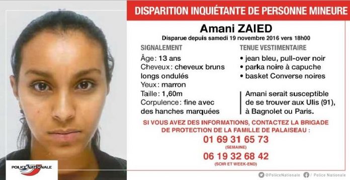 La jeune fille, du nom d’Amani Zaied, est âgée de 13 ans. Elle a les cheveux bruns, long et ondulés, les yeux couleur marron. Elle mesure 1,60 m et a la taille fine avec les hanches marquées, selon la description de la police.