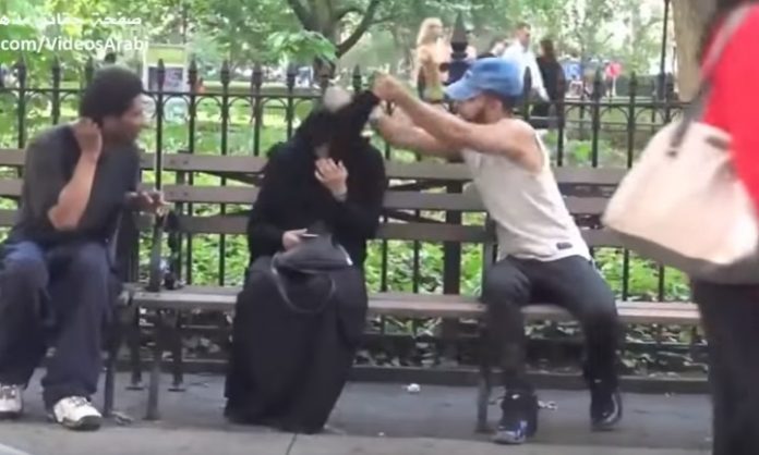 Certains tentent même de le frapper tant ils sont choqués par sa violence envers la jeune musulmane.