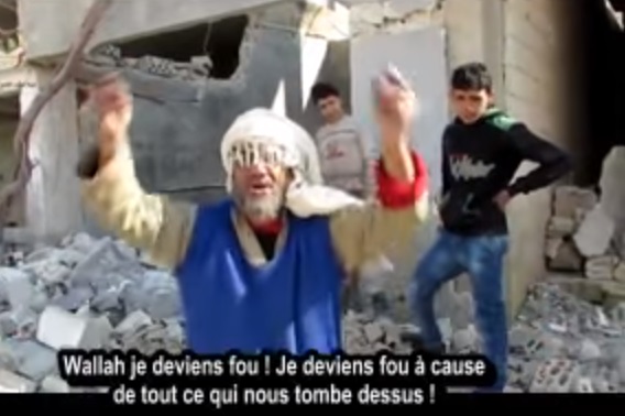 Les cris de douleur d’un syrien au bord des larmes, épuisé par la barbarie ambiante en Syrie. Des femmes et des enfants sont souvent forcés de payer le plus lourd tribut, mais aucun terroriste n’a été retrouvé sous les décombres causés par les bombes assourdissantes russes.