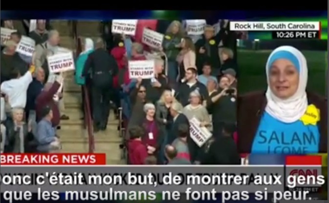 Une femme voilée expulsée d'un meeting de Donald Trump."Salam je viens en paix" inscrit sur son t-shirt, une femme voilée se lève pendant un meeting de Donal Trump pour protester en silence. Rose Hamid, une musulmane hôtesse de l'air de 56 ans, s'est rendu à un meeting de Donal Trump (candidat aux présidentielles américaines) pour protester contre ses discours anti-musulmans. Donald Trump avait notamment proposé de fermer les frontières aux musulmans suite aux attentats de Paris.Rose Hamid raconte qu'au début du meeting tout le monde était bienveillant envers elle, pendant le meeting elle s'est levé pour protester en silence, elle est alors priée de quitter le meeting et un policier la raccompagne à la sortie, la foule est alors devenue de plus en plus haineuse.