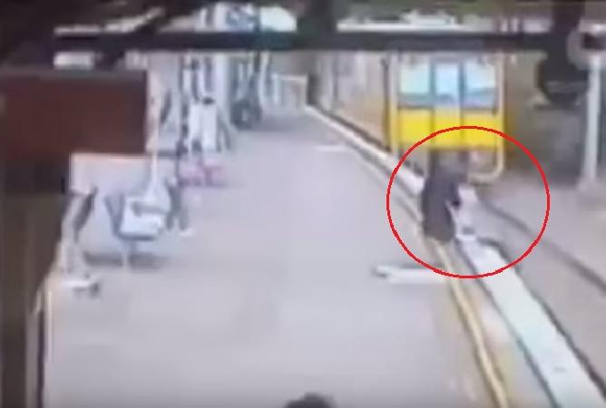 Dans cette vidéo dont la scène se déroule à la station de Flemington (vers Sydney), on peut y voir une jeune fille tomber subitement sur les rails après avoir tenté de récupérer le cerceau avec lequel elle s’amusait; mais c’était sans compter la très courageuse intervention d’une musulmane vêtue d’un hijab qui a réussi in extremis à la sauver seulement quelques secondes avant l’arrivée d’un train.