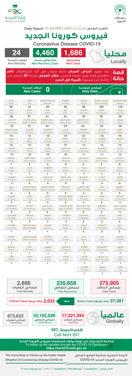 Le reste des nouvelles infections a été confirmé dans des villes et des provinces d’Arabie saoudite.