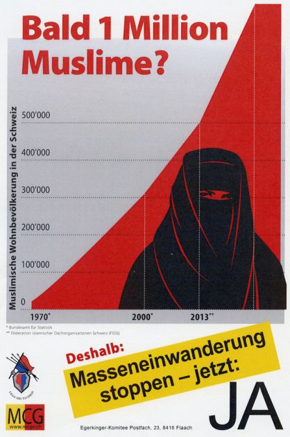 On peut lire pathétiquement sur l’affiche : «Bientôt 1 million de musulmans ? Donc : stop à l’immigration de masse». Ce texte accompagne une courbe montrant la hausse des musulmans du pays dont le fond est une femme en niqab ! L’islamophobie dans son état le plus basique.