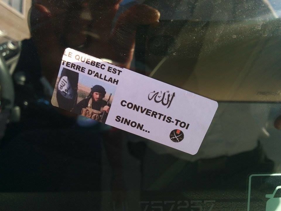 Un habitant de la ville de Repentigny au Québec (Canada), a trouvé collé sur le véhicule de sa belle-fille, un autocollant ordonnant à la population à se convertir à l’Islam.