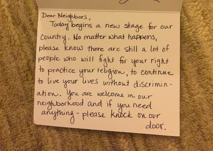 « Aujourd’hui commence une nouvelle étape pour notre pays. Peu importe ce qu’il se passe, sachez qu’il y a toujours beaucoup de personnes qui se battront pour votre droit à pratiquer votre religion, de continuer à vivre vos vies sans discrimination. Vous êtes bienvenus dans notre quartier et si vous avez besoin de quoi que ce soit, s’il vous plait, tapez à notre porte. »