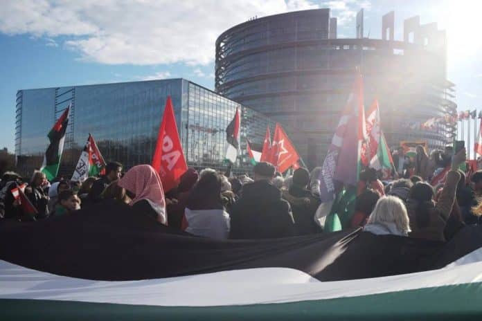 Une manifestation a éclaté hier devant le Parlement européen à Strasbourg, en France, appelant à la protection du peuple palestinien.