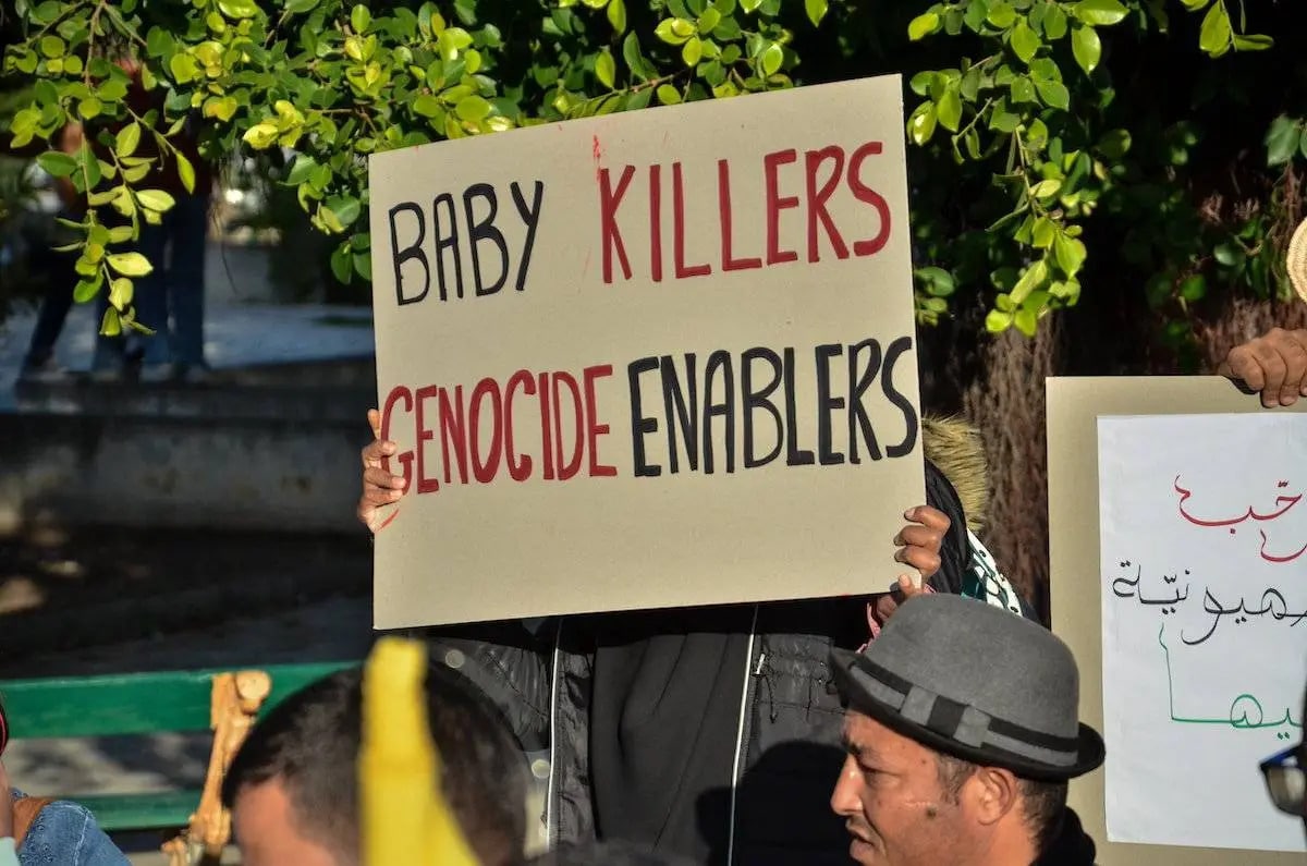 Les manifestants répondaient à l’appel du « Réseau tunisien pour résister à la normalisation avec Israël » – une coalition d’associations tunisiennes et de figures publiques. Ils portaient des banderoles avec des slogans tels que : « Gaza, le symbole de la fierté », « Du sang pour du sang, du feu pour du feu, le sioniste doit tomber » et « Un seul front de résistance ».