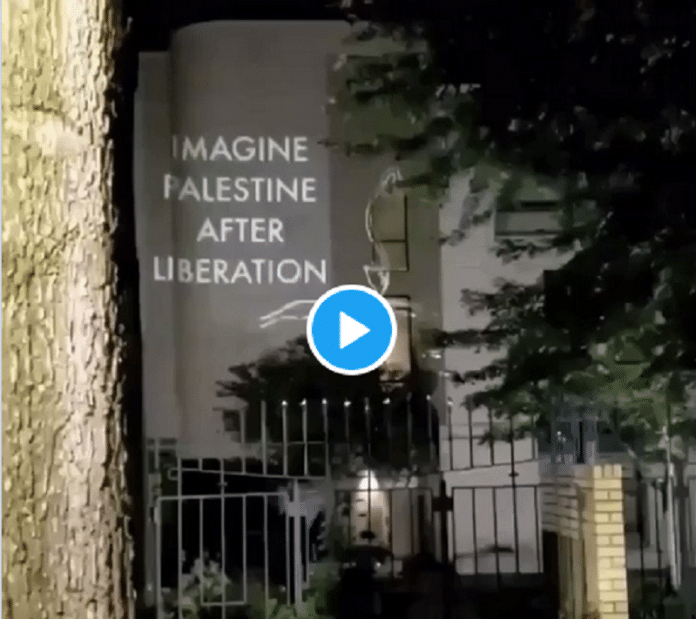Magnifique projection réalisée par Occupation Free DC sur les murs de l’Ambassade d’Israël à #Washington, le 12 août 2020.