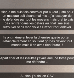 « Hier je me suis fait contrôler par quatre policiers pour un masque soi-disant mal mis. J’ai essayé de me défendre par tous les moyens. Je ne vais pas rentrer dans les détails mais au final, je me suis retrouvée sans mon voile ! »