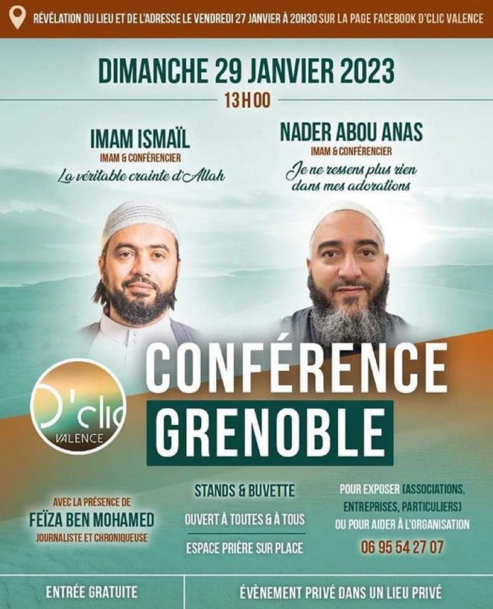 Une conférence prévue le dimanche 29 janvier, des imams Ismael de Marseille et Nader Abou Anas organisée par l’association D’Clic à Grenoble pour traiter de la « perte de repère« , des « désastres des réseaux sociaux« , des « débilités des programmes télévisés« , de la nécessité de « reprendre sa vie en main »a été annulé suite à la pression politique de mouvements d’extrême-droite.