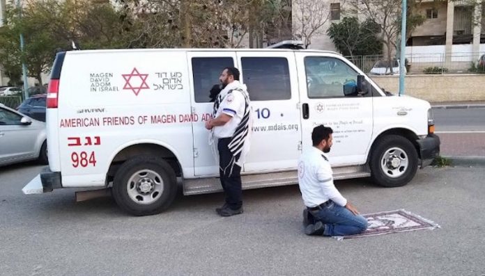 Sur cette photo, nous pouvons voir un ambulancier juif, Avraham Mintz, se tourner vers Jérusalem pour effectuer sa prière tandis que son collègue, musulman, Zoher Abu Jama, se tourne vers La Mecque pour s’acquitter d’une de ses cinq prières quotidiennes.
