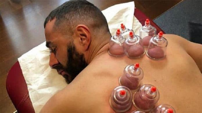 » La star des banlieues islamisée Karim Benzema se met à pratiquer la médecine prophétique avec une séance de sorcellerie hijama roqya (ventouses). »