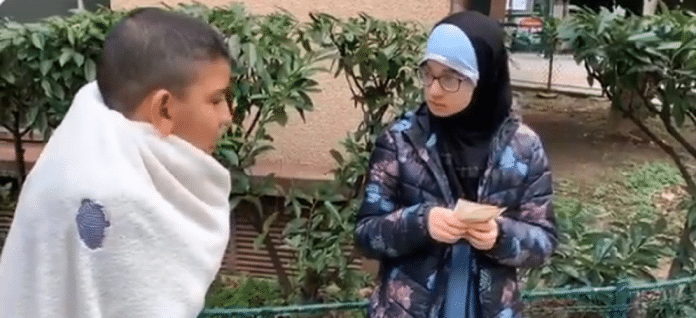 On voit les enfants de l’école musulmane MHS interpréter les rôles d’une musulmane, d’un chrétien et d’un juif face à un homme pauvre qui leur demande de l’argent.