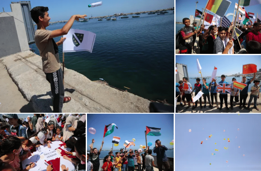 Rassemblés au port de Gaza, les mineurs ont écrit des lettres soulignant leurs rêves et leurs aspirations, les ont mis dans des bouteilles et les ont jetés à la mer dans l’espoir qu’ils atteignent le monde.