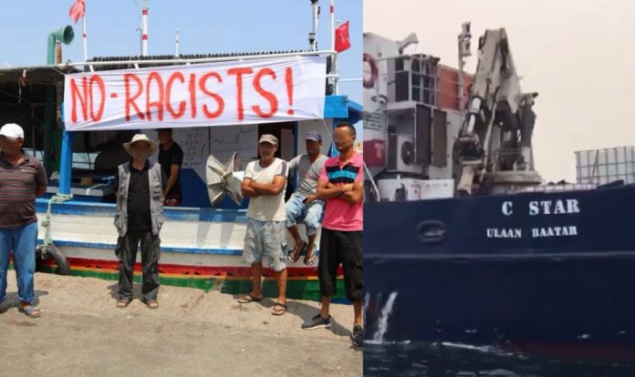 Armés de banderoles « Non aux racistes », les pêcheurs tunisiens bloquent le passage des côtes de Zarzis en Tunisie.