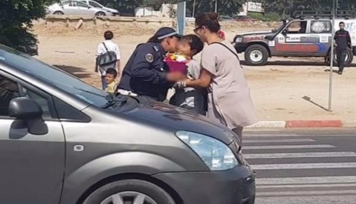 La policière a chaleureusement remercié l’enfant et lui a fait un petit bisou sur la joue.