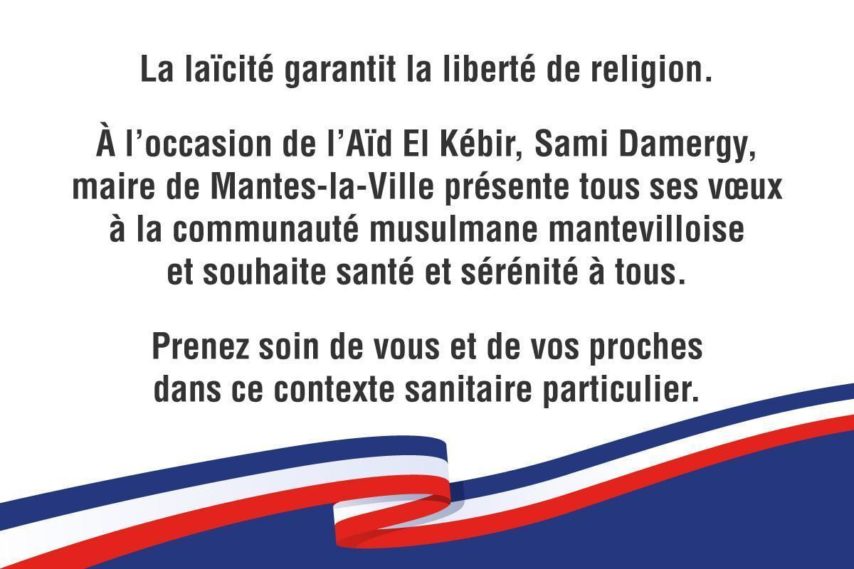 La mairie de Mantes-la-Ville a publié un message le 31 juillet pour la fête du mouton, sur sa page Facebook : « La laïcité garantit la liberté de religion. A l’occasion de l’Aïd el-Kébir, Sami Damergy, maire de Mantes-la-Ville, présente tous ses vœux à la communauté musulmane mantevilloise et souhaite santé et sérénité à tous. »