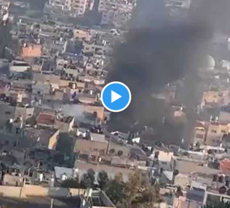 Des explosions et des coups de feu nourris peuvent être entendus sur des images de téléphones portables partagées par des résidents du camp, avec des panaches de fumée noirs s’élevant à plusieurs endroits. Des tireurs d’élite israéliens se sont déployés sur les toits et l’armée a tiré à balles réelles, gaz lacrymogène et missiles antichars sur les résidents du camp confrontés aux soldats.