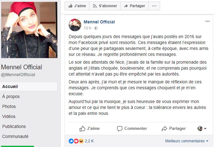 La jeune chanteuse Menelle Ibtissem a tenu à présenter ses excuses sur Facebook après le matraquage médiatique qu’elle a subi pour des tweets datant de 2016. Accusée d’extrémisme, certains ont même demandé à ce qu’elle soit exclue de The Voice, l’émission de TF1.