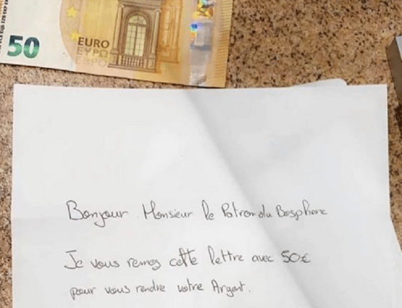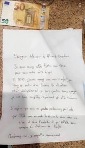 Je vous remets cette lettre avec 50 euros pour vous rendre votre argent. En 2010, j’avais mangé avec mes 4 enfants. Je venais de sortir d’un divorce, la situation était désespérée. Je suis partie sans payer. Et je me suis rappelé récemment cette histoire. J’espère que vous me pardonnerez pour cela. Qu’Allah vous accorde la réussite dans votre vie ici-bas et dans l’Au-delà et qu’Allah vous épargne du châtiment de l’Enfer. Pardonnez-moi, je regrette sincèrement. »