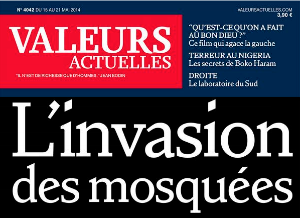 Le directeur de Valeurs actuelles, Yves de Kerdrel, vente le contenu de son nouveau numéro sur Twitter de manière totalement décomplexée : « Enquête exceptionnelle dans le prochain numéro de @Valeurs : il se construit en France chaque semaine 2 nouvelles mosquées. Une invasion ».