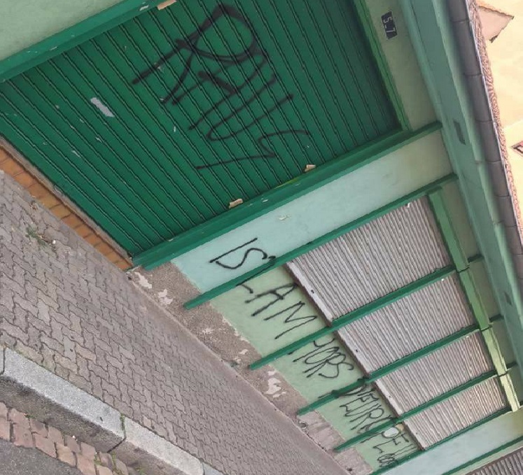 Agressions, vandalisme, injures, les mosquées sont les premières visées par cette montée islamophobe. Sur cette image, des inscriptions racistes peintes sur l’enceinte d’une mosquée à Strasbourg «Islam hors d’Europe» et «RauS» (dehors en allemand avec le S des «SS»), de la même manière que sur les devantures des magasins appartenant à des juifs dans les années ’30.