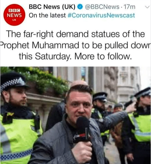 La chaine d’information BBC News UK a diffusé sur son compte Twitter l’appel des sympathisants d’extrême-droite appelant à détruire toutes les statues du Prophète Mohammed ﷺ à l’instar des statues symbolisants l’esclavage qui se sont vues déboulonnées par les militants du mouvement Black Live Matters.