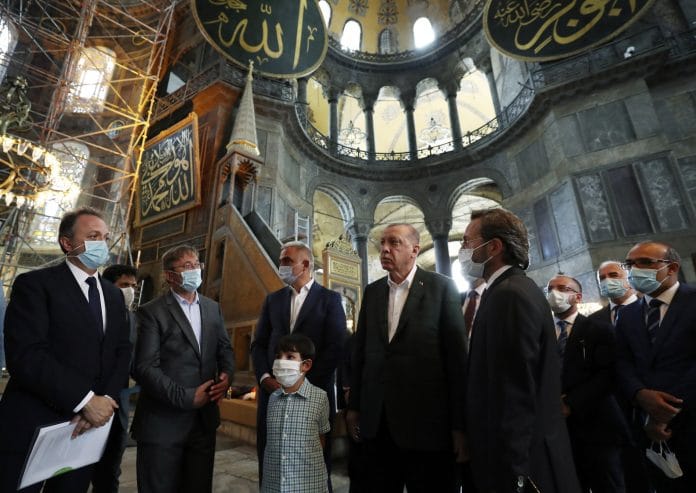 Le président turc Recep Tayyip Erdogan a effectué une visite surprise à Sainte-Sophie quelques jours à peine avant la tenue des premières prières musulmanes au monument d’Istanbul depuis sa reconversion en mosquée la semaine dernière.