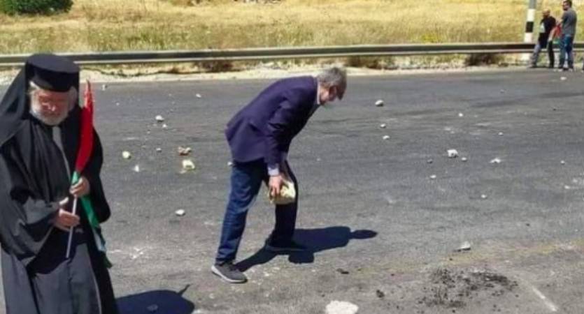 ?? | L’archevêque de l’Église grecque-catholique melkite Abdallah Yulio lançant des pierres sur les forces de l’ordre israéliennes. pic.twitter.com/xtg3JuNU2N