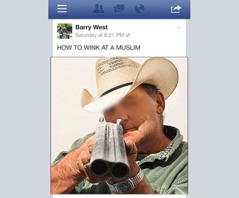 Barry West, un élu local du comté de Coffee (Tennessee) a posté samedi dernier sur son compte Facebook la photo d’un homme avec un chapeau de cow-boy et ajustant la mire de son fusil, avec comme descriptif: "How to wink at a muslim" soit "Comment faire un clin d’œil à un musulman" , c’est ce que nous apprend le site de news Ibtimes.