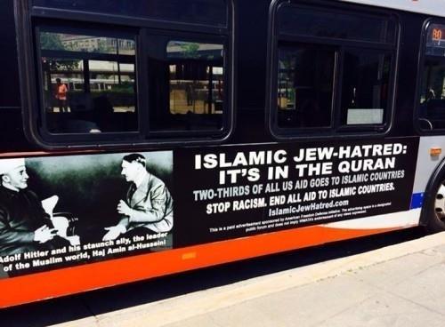 Cette affiche, associant de manière très explicite l’Islam au nazisme, apparaît désormais sur les Métrobus de Washington DC. Ainsi, nous pouvons lire sur cette affiche : « La haine islamique des Juifs : c’est dans le Coran ».