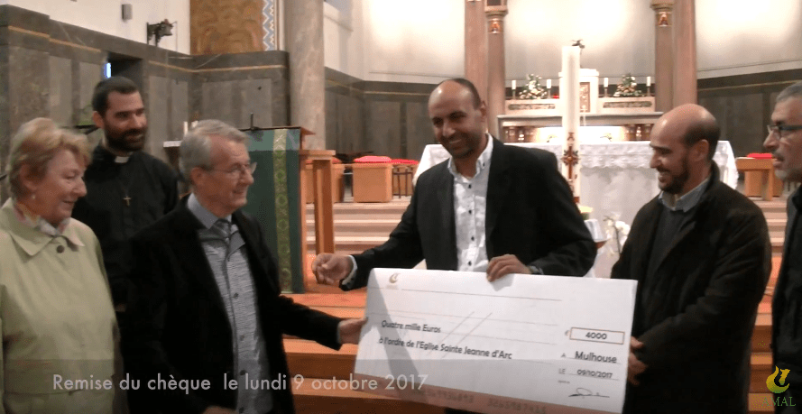 La mosquée Annour de Mulhouse en Alsace a fait preuve de tolérance et de générosité sans précédent. Alors que l’Église catholique Saint-Jeanne d’Arc avait fait un appel à l’aide pour la rénovation de l’église, les fidèles de la mosquée décident de lui venir en aide. Une collecte de dons a permis de réunir 4000 euros au profit de l’église. Le chèque a été remis au responsable du culte par la présence des responsables de l’association musulmane de la mosquée.