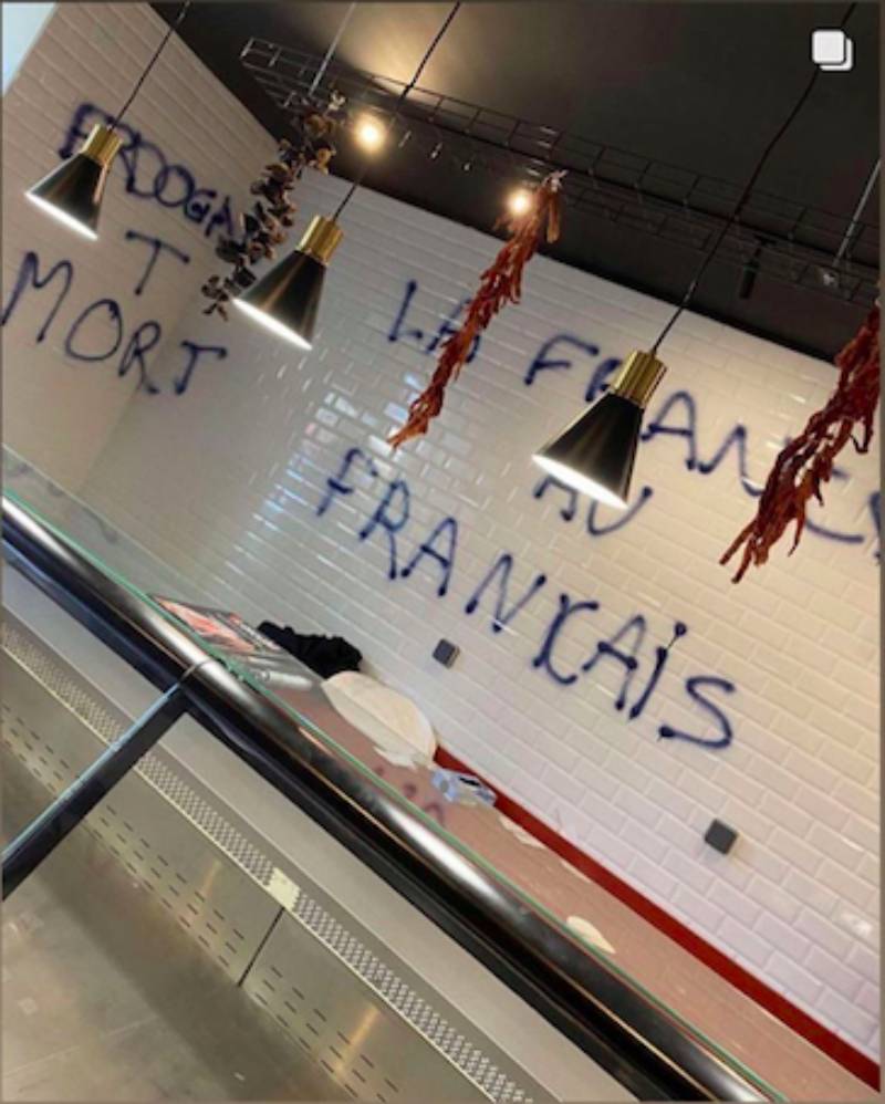 On pouvait lire au sein de la boucherie halal des inscriptions telles que « La France aux Français », « Dégagez d’ici, Rentrez chez vous », « Vive le Porc »,…
