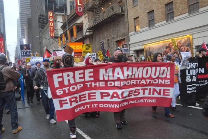 Des manifestants opposés aux politiques israéliennes se sont rassemblés samedi soir à Times Square, à New York, pour exiger la libération de Mahmoud Khalil, étudiant en master à l’université Columbia, qui a été placé en détention, selon un rapport de médias américains.