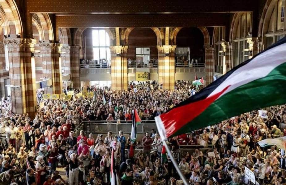Plus de 1 500 manifestants ont envahi la gare centrale d’Amsterdam, tandis que près de 1 000 autres se sont rassemblés à la gare centrale de Rotterdam. Les protestataires brandissaient des drapeaux palestiniens et frappaient sur des casseroles, des assiettes et des louches des symboles de la famine imposée à la population de Gaza en raison du blocus israélien sur la nourriture et les produits de première nécessité.