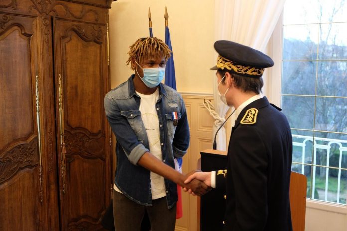 Alpha Moussavou a reçu la médaille d’honneur pour acte de courage et de dévouement à la sous-préfecture de Vire Normandie dans le Calvados. Le 22 octobre 2021, il a volé au secours d’une femme qui se faisait étrangler par son mari dans un logement d’urgence dédiée à l’accueil des femmes victimes de violences.