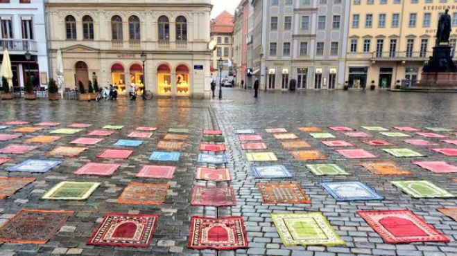 L’artiste Kurt Fleckenstein a déroulé lundi dernier 176 tapis de prière pour symboliser « la liberté de croyance, l’ouverture et la tolérance ». Des mots que l’on avait presque oubliés.
