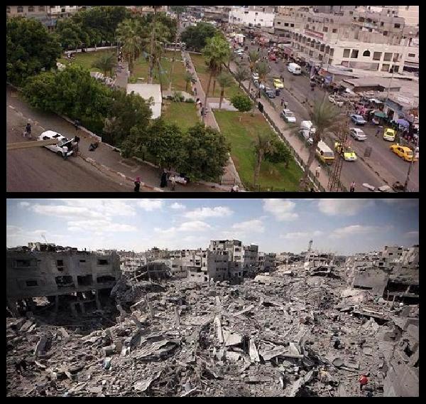 Ces deux photos montrent le quartier de Chajaya, à l’Est de Gaza, avant et après les bombardements. Le résultat est méconnaissable : le quartier est totalement rasé, nous n’y voyons que des débris, plus rien n’est resté en place. C’est à peine si l’on reconnaît quelque chose sous ce tas de décombres.