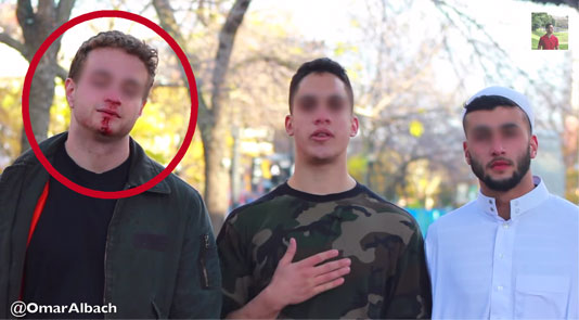 Dans un deuxième abri bus, la même scène est rejouée et l’un des passants met un coup de poing à l’acteur qui joue le rôle de l’islamophobe.