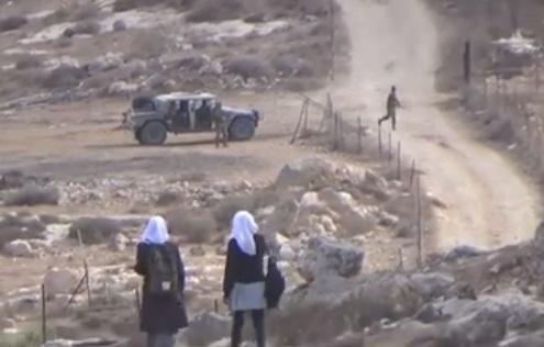 Ces soldats israéliens sont censés défendre les enfants palestiniens du village d’al-Tuwani des attaques des colons de la colonie voisine de Havat Maon. Mais au lieu de cela, ils envoient des projectiles sur les têtes des enfants au risque de les blesser ou pire, de les tuer.