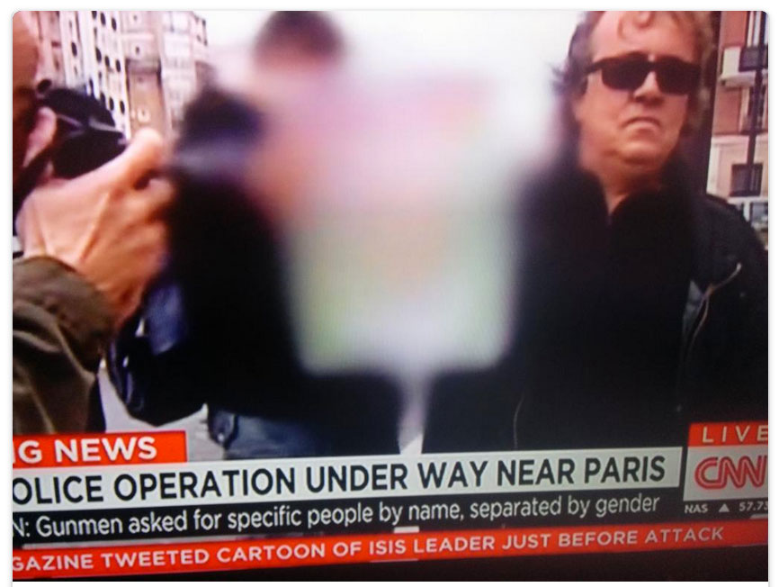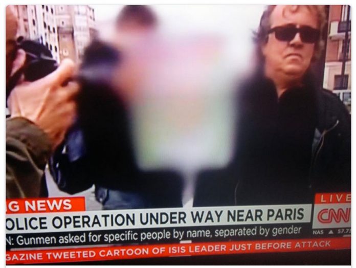 Un des patrons de la chaîne d’info en continu CNN, Richard Griffiths, a expressément demandé à toute son équipe de ne pas diffuser les dessins de Charlie Hebdo et d’éviter les plans trop rapprochés des manifestants possédant un exemplaire entre les mains.