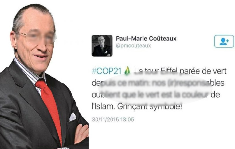 Dans un tweet aussi ridicule que pathétique, Coûteaux exprime sa colère : « COP21 La Tour Eiffel parée de vert depuis ce matin : nos (ir)responsables oublient que le vert est la couleur de l’islam. Grinçant symbole ! »
