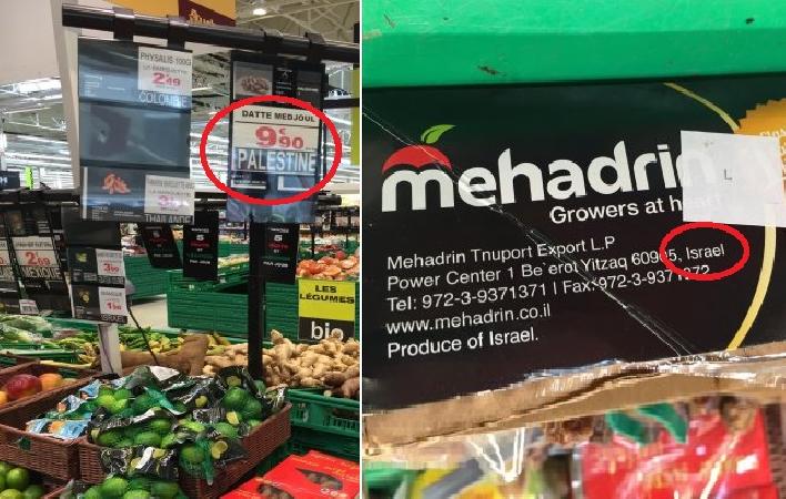 Auchan tenterait de faire croire que les dattes Medjoul seraient d’origine palestinienne. La pancarte suspendue au-dessus du produit comporte effectivement la mention « Origine Palestine », mais si on se concentre sur les cartons stockant les dattes, on peut apercevoir une provenance différente: « Israël » !