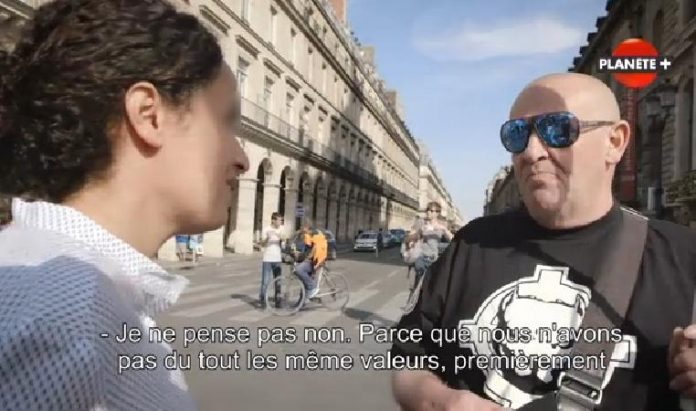 L’homme vêtu d’un t shirt orné d’une croix celtique et d’un gros molosse répond avec un aplomb terrifiant au question d’Amelle Chahbi.